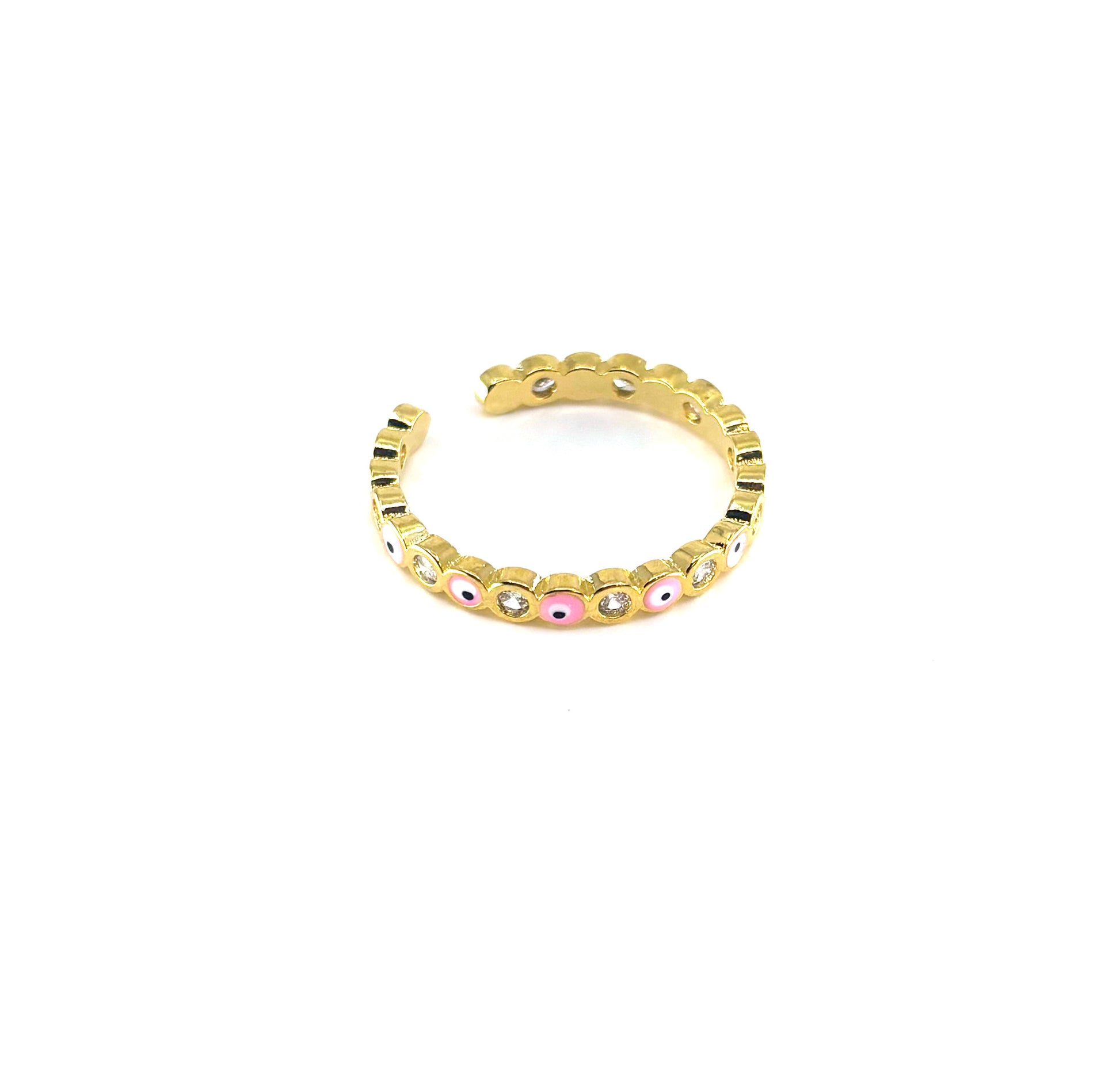 Ward off negative vibes with a touch of modern charm! This delicate gold-toned ring features a playful and protective band of alternating pink and sparkling clear 'evil eye' motifs. Its adjustable design ensures a comfortable fit, making it perfect for everyday wear or stacking.