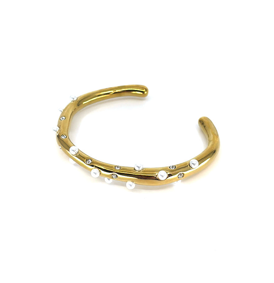 The Sprinkle Cuff is a graceful fusion of organic design and celestial charm. Crafted in a radiant gold finish, this sleek, handcrafted cuff is adorned with scattered pearls and shimmering crystal accents, reminiscent of dewdrops catching the morning light. Its fluid, open-ended shape ensures a comfortable and adjustable fit, making it perfect for layering or wearing solo as a subtle yet striking statement.